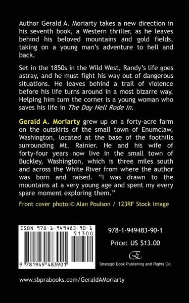 Author Gerald A. Moriarty takes a new direction in his seventh book, a Western thriller, as he leaves behind his beloved mountains and gold fields, taking on a young man’s adventure to hell and back. Set in the 1850s in the Wild West, Randy’s life goes astray, and he must fight his way out of dangerous situations. He leaves behind a trail of violence before his life turns around in a most bizarre way. Helping him turn the corner is a young woman who saves his life in The Day Hell Rode In. Author Bio: Gerald A. Moriarty grew up on a forty-acre farm on the outskirts of the small town of Enumclaw, Washington, located at the base of the foothills surrounding Mt. Rainier. He and his wife of forty-four years now live in the small town of Buckley, Washington, which is three miles south and across the White River from where the author was born and raised. "I was drawn to the mountains at a very young age and spent my every spare moment exploring them." Publisher’s website: www.sbprabooks.com/GeraldAMoriarty