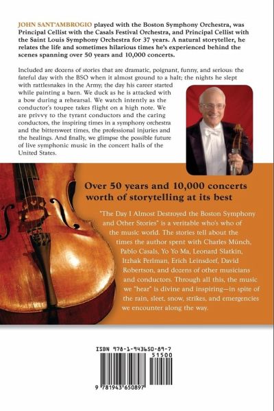 This is a veritable who's who of the music world. The stories tell about the times the author spent with Charles Munch, Pablo Casals, Yo Yo MA, Leonard Slatkin, Itzhak Perlman, Leonard Robertson, and dozens of other musicians and conductors. Through all of this, the music we "hear" is divine and inspiring - in spite of the emergencies along the way. Included are dozens of stories that are dramatic, poignant, funny, and serious: the fateful day with the BSO when it almost ground to a halt; the nights he slept with rattlesnakes in the Army; the day his career started while painting a barn. John Sant' Ambrogio played with the Boston Symphony Orchestra, was principal Cellist with the Casals Festival Orchestra, and Principal Cellist with the Saint Louis Symphony Orchestra for 37 years. A natural storyteller, he relaates the life and sometimes hilarious times he's experienced behind the scenes spanning over 50 years and 10,000 concerts.
