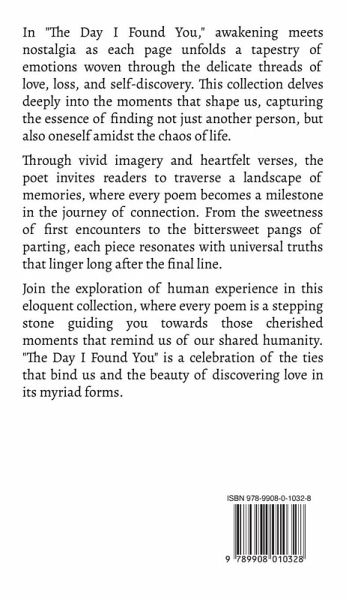 In "The Day I Found You," awakening meets nostalgia as each page unfolds a tapestry of emotions woven through the delicate threads of love, loss, and self-discovery. This collection delves deeply into the moments that shape us, capturing the essence of finding not just another person, but also oneself amidst the chaos of life. Through vivid imagery and heartfelt verses, the poet invites readers to traverse a landscape of memories, where every poem becomes a milestone in the journey of connection. From the sweetness of first encounters to the bittersweet pangs of parting, each piece resonates with universal truths that linger long after the final line. Join the exploration of human experience in this eloquent collection, where every poem is a stepping stone guiding you towards those cherished moments that remind us of our shared humanity. "The Day I Found You" is a celebration of the ties that bind us and the beauty of discovering love in its myriad forms.