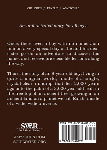 Once, there lived a boy with no name. Join him on a very special day as he and his dear sister go on an adventure to discover his name, and receive priceless life lessons along the way. This is the unillustrated story of an 8-year-old boy, living in quite a magical world, inside of a single, crystal-clear raindrop that fell 2,000 years ago onto the palm of a 3,000-year-old leaf, in the tree-top of an ancient tree, growing in an ancient land on a planet we call Earth, inside of a wide, wide universe.