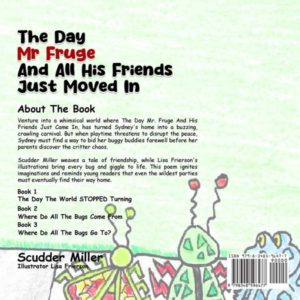 Venture into a whimsical world where The Day Mr. Fruge And His Friends Just Came In, has turned Sydney's home into a buzzing, crawling carnival. But when playtime threatens to disrupt the peace, Sydney must find a way to bid her buggy buddies farewell before her parents discover the critter chaos. Scudder Miller weaves a tale of friendship, while Lisa Frierson's illustrations bring every bug and giggle to life. This poem ignites imaginations and reminds young readers that even the wildest parties must eventually find their way home.