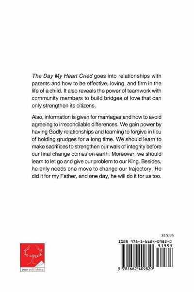 The Day My Heart Cried goes into relationships with parents and how to be effective, loving, and firm in the life of a child. It also reveals the power of teamwork with community members to build bridges of love that can only strengthen its citizens. Also, information is given for marriages and how to avoid agreeing to irreconcilable differences. We gain power by having Godly relationships and learning to forgive in lieu of holding grudges for a long time. We should learn to make sacrifices to strengthen our walk of integrity before our final change comes on earth. Moreover, we should learn to let go and give our problem to our King. Besides, he only needs one move to change our trajectory. He did it for my Father, and one day, he will do it for us too.