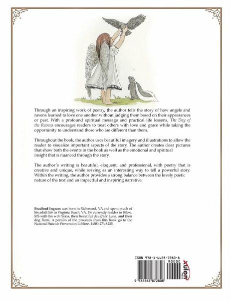Through an inspiring work of poetry, the author tells the story of how angels and ravens learned to love one another without judging them based on their appearances or past. With a profound spiritual message and practical life lessons, The Day of the Ravens encourages readers to treat others with love and grace while taking the opportunity to understand those who are different than them.Throughout the book, the author uses beautiful imagery and illustrations to allow the reader to visualize important aspects of the story. The author creates clear pictures that show both the events in the book as well as the emotional and spiritual insight that is nuanced through the story.The author's writing is beautiful, eloquent, and professional, with poetry that is creative and unique, while serving as an interesting way to tell a powerful story. Within the writing, the author provides a strong balance between the lovely poetic nature of the text and an impactful and inspiring narrative. Bradford Ingram was born in Richmond, VA and spent much of his adult life in Virginia Beach, VA. He currently resides in Biloxi, MS with his wife Syria, their beautiful daughter Luna, and their dog Remi. A portion of the proceeds from this book go to the National Suicide Prevention Lifeline, 1-800-273-8255.