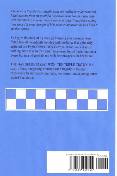 The news of Secretariat's death made me realize how far removed I had become from my youthful obsession with horses, especially with Secretariat, a horse I had never even seen. It had been a long time since I'd even thought of him or how important he had been to me that spring. So begins the story of a young girl turning into a woman who found herself inexplicitly bonded with the horse that ultimately achieved the Triple Crown. Only Carolyn, who'd once wanted nothing more than to own and ride a horse, found herself not on a horse, but in a wheelchair and with few prospects for her future. THE DAY SECRETARIAT WON THE TRIPLE CROWN is a story of how one young woman turned tragedy to triumph, encouraged by her family, her faith, her horse...and a young horse named Secretariat.