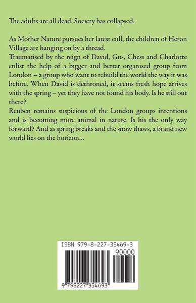 The adults are all dead. Society has collapsed. As Mother Nature pursues her latest cull, the children of Heron Village are hanging on by a thread. Traumatised by the reign of David, Gus, Chess and Charlotte enlist the help of a bigger and better organised group from London - a group who want to rebuild the world the way it was before. When David is dethroned, it seems fresh hope arrives with the spring - yet they have not found his body. Is he still out there? Reuben remains suspicious of the London groups intentions and is becoming more animal in nature. Is his the only way forward? And as spring breaks and the snow thaws, a brand new world lies on the horizon...