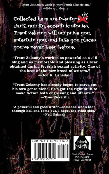 New affordable edition of the first collected stories of Trent Zelazny. Includes the original twenty-four dark, quirky, eccentric tales published in 2009, plus two newly added yarns excavated from Zelazny's reprehensible vault. These stories will surprise you, entertain you, possibly upset or offend you at times, and will take you places you've never been before. Rather than trying to make a career of covering the same ground his father had already plowed, Trent Zelazny opted to do his own thing, and established right out of the gate that he was-and still is-his own man. Features a new introduction by the author. Two additional stories: "The Ten-In-One" and "Chicken Strips." "Trent Zelazny's work is as powerful as a .45 slug and as memorable and pleasing as a scar obtained during feverish sexual activity. One of the best of the new breed of writers." -Joe R. Lansdale "Trent Zelazny's work is pure Punk Classicism, with a spirit and heart and ferocious inquiry that dance across multiple genres and forever change their landscape. When I first read The Day the Leash Gave Way, I literally couldn't speak for some time. I had to know more, read more...and merely scratch the surface of an SFnal dynasty to find this great friend and inspiration. He never disappoints." -Edward Morris