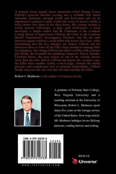 A tropical storm named Jason transforms Chief Deputy Conor Gifford's peaceful October evening into a veritable hell. Jason unleases hurricane strength winds and horizontal rain on an unprepared Loudoun County. Under the cover of Jason's wrath, a killer strikes five times in six short hours. His victims include a world famous billionaire, a high tech millionaire, a local developer, a simple realtor and the Chairman of the Loudoun County Board of Supervisors. Gifford, the Chief of the Loudoun Sheriff Department's Investigative Division, and his ten man detective squad confront a serial killer who leaves few clues. After determining that the five murders are linked, Gifford and his detectives have to fend off the FBI's inept attempt to manage their investigation. This brings Gifford into direct conflict with a former girl friend, the beautiful but ambitious Inspector Tracey Schultz. Charlotte Peters, the sexy widow of one of the victims, knows more than she tells. Before Gifford can master the complex case, the killer takes another victim, a local judge. Despite the media pressure and complicated mix of personal relationships, Gifford finally uncovers the one clue that lets him identify the killer. Robert L Skidmore is the author of fourteen novels.