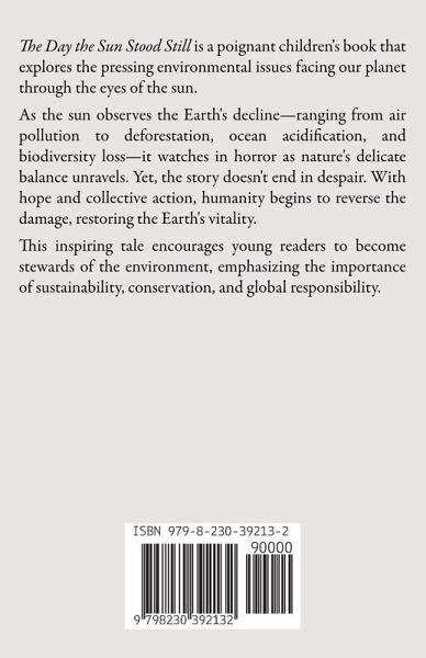 The Day the Sun Stood Still is a poignant children's book that explores the pressing environmental issues facing our planet through the eyes of the sun. As the sun observes the Earth's decline-ranging from air pollution to deforestation, ocean acidification, and biodiversity loss-it watches in horror as nature's delicate balance unravels. Yet, the story doesn't end in despair. With hope and collective action, humanity begins to reverse the damage, restoring the Earth's vitality. This inspiring tale encourages young readers to become stewards of the environment, emphasizing the importance of sustainability, conservation, and global responsibility.