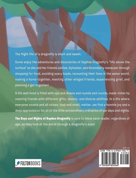 The flight life of a dragonfly is short and sweet. Come enjoy the adventures and discoveries of Daphne Dragonfly's "life above the surface" as she and her friends Jubilee, Sylvester, and Serendipity maneuver through shopping for food, avoiding scary toads, recounting their lives in the water world, making a home together, meeting other winged friends, experiencing grief, and planning a get-together! A life well lived is filled with ups and downs and rounds and rounds, made richer by meeting friends with different gifts, talents, and diverse abilities. In a life where everyone counts and all voices, loud and small, matter...we find a humble joy and a deep appreciation for all of the little extraordinary ordinaries of our days and nights. The Days and Nights of Daphne Dragonfly is sure to bless each reader, regardless of age, as they look at the world through a dragonfly's eyes!