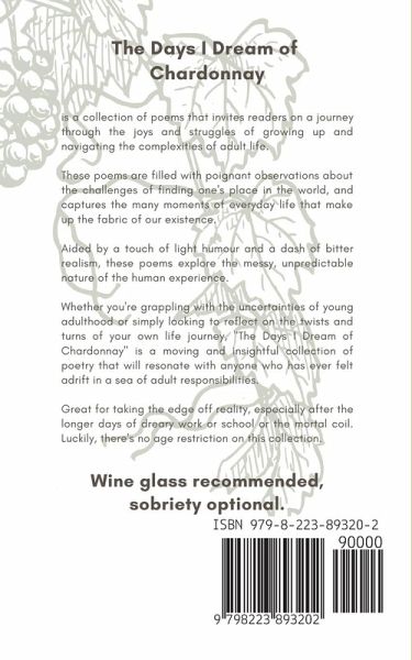 A collection of poems that invites readers on a journey through the joys and struggles of growing up and navigating the complexities of adult life. These poems are filled with poignant observations about the challenges of finding one's place in the world, and captures the many moments of everyday life that make up the fabric of our existence. Aided by a touch of light humour and a dash of bitter realism, these poems explore the messy, unpredictable nature of the human experience. Whether you're grappling with the uncertainties of young adulthood or simply looking to reflect on the twists and turns of your own life journey, "The Days I Dream of Chardonnay" is a moving and insightful collection of poetry that will resonate with anyone who has ever felt adrift in a sea of adult responsibilities. Great for taking the edge off reality, especially after the longer days of dreary work or school or the mortal coil. Luckily, there's no age restriction on this collection. Wine glass recommended, sobriety optional. PERFECT FOR FANS OF... Rupi Kaur, Sylvia Plath, and Emily Dickinson.