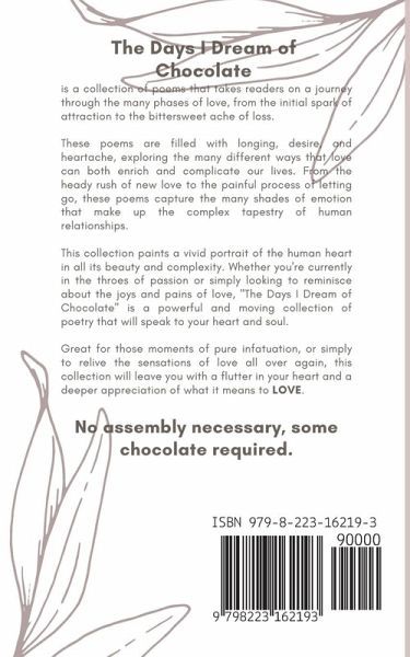 Praise for The Days I Dream of Chocolate... "The Days I Dream of Chocolate" is a cozy read. The overall thematics can be understood by and are relatable to anyone; any reader can find something to take away. The allusions and, often, the diction are quite charming and occasionally quite clever." ~ Matt, Editor, FlukyFiction "Unique, engaging and definitely a piece of work that is strong and memorable. Each poem here is different, not one even verges on being the same, and the contextual nature of the poems means there is so much more in the depths of these poems than what is first noticed when read. I think - and I hope - that this book will be a piece of work others reference when writing from different points of view." ~ Rhys Milsom, Poet Description: A collection of poems that takes readers on a journey through the many phases of love, from the initial spark of attraction to the bittersweet ache of loss. These poems are filled with longing, desire, and heartache, exploring the many different ways that love can both enrich and complicate our lives. From the heady rush of new love to the painful process of letting go, these poems capture the many shades of emotion that make up the complex tapestry of human relationships. This collection paints a vivid portrait of the human heart in all its beauty and complexity. Whether you're currently in the throes of passion or simply looking to reminisce about the joys and pains of love, "The Days I Dream of Chocolate" is a powerful and moving collection of poetry that will speak to your heart and soul. Great for those moments of pure infatuation, or simply to relive the sensations of love all over again, this collection will leave you with a flutter in your heart and a deeper appreciation of what it means to LOVE. No assembly necessary, some chocolate required. PERFECT FOR FANS OF... Rupi Kaur, Sylvia Plath, and Emily Dickinson.