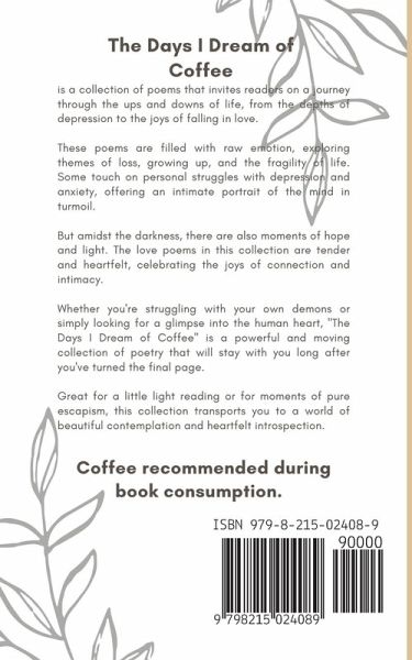 Praise for The Days I Dream of Coffee - L.M.Sanguinette "Beautiful poems about dealing with the bitter realities of life, love, and loss" - Simone S., Reader "A fun read" - Cara F., Editor, Fluky Fiction "I love the way the poems are split up into various forms of coffee - so clever and personal! The content of the poems is varied, but still cohesive, and overall, this is a great read." - Anya J., Editor, Independent "Each poem is enchanting, and the storytelling is beautiful!" - David D., Reader A collection of poems to warm the heart, with topics ranging from the mundane enjoying of a cup of coffee in the mornings, to the dealing with tragedies of death and loss. This collection dives into the raw feelings behind passionate themes such as love and grief, and gives some insight into the way depression and anxiety manifest themselves in modern life. Great for those wishing to curl up with with a quick read and a warm cup of coffee. Readers of this collection are delighted with the relatability and intricate storytelling woven into each poem. From the light-hearted and contemplative to the sombre and serious, this collection has a poem for all. The collection is divided into six sections, each taking the name of a different coffee beverage: Latte, Cappuccino, Iced, Black, Espresso, and Bombon, with poems whose contents match that of their section. Great for a little light reading or for moments of pure escapism. Coffee recommended during book consumption. "Sometimes, it's nice to have our pain seen. Other times, all we desire is hope for the better days." - L.M.Sanguinette