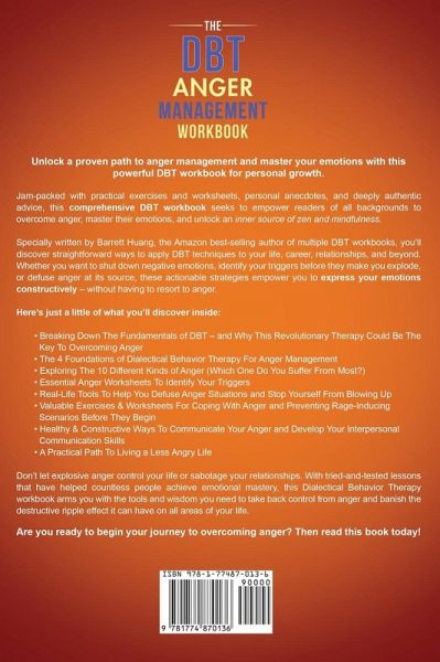 Unlock a proven path to anger management and master your emotions with this powerful DBT workbook for personal growth. Do you often find yourself struggling to control your frustration? Are you tired of blowing up at your friends, family, and co-workers? Or do you want to discover a new source of inner peace and tranquility? Then this book is for you. Jam-packed with practical exercises and worksheets, personal anecdotes, and deeply authentic advice, this comprehensive DBT workbook seeks to empower readers of all backgrounds to overcome anger, master their emotions, and unlock an inner source of zen and mindfulness. Specially written by Barrett Huang, the Amazon best-selling author of multiple DBT workbooks, you'll discover straightforward ways to apply DBT techniques to your life, career, relationships, and beyond. Whether you want to shut down negative emotions, identify your triggers before they make you explode, or defuse anger at its source, these actionable strategies empower you to express your emotions constructively - without having to resort to anger. If you struggle to stay calm, or if you're prone to freakouts or explosive outbursts, this book sheds an illuminating light on the topic of anger management, providing a refreshing perspective that will empower you to begin - or continue - your journey to enjoying a less angry life. This book encourages you to uncover the hidden sources of your anger, overcome the shame and frustration that accompany it, find the strength to be more vulnerable, and start healing the emotional scars that anger causes. Here's just a little of what you'll discover inside: Breaking Down The Fundamentals of DBT - and Why This Revolutionary Therapy Could Be The Key To Overcoming Anger The 4 Foundations of Dialectical Behavior Therapy For Anger Management Exploring The 10 Different Kinds of Anger (Which One Do You Suffer From Most?) Essential Anger Worksheets To Identify Your Triggers Real-Life Tools To Help You Defuse Anger Situations and Stop Yourself From Blowing Up Valuable Exercises & Worksheets For Coping With Anger and Preventing Rage-Inducing Scenarios Before They Begin Healthy & Constructive Ways To Communicate Your Anger and Develop Your Interpersonal Communication Skills A Practical Path To Living a Less Angry Life And So Much More... Don't let explosive anger control your life or sabotage your relationships. With tried-and-tested lessons that have helped countless people achieve emotional mastery, this Dialectical Behavior Therapy workbook arms you with the tools and wisdom you need to take back control from anger and banish the destructive ripple effect it can have on all areas of your life. Are you ready to begin your journey to overcoming anger? Then scroll up and grab your copy today!