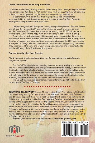 Charlie's introduction to his blog put it best: "A lifetime in marketing actually equips a man for very little... Now pushing 58, I realise with some horror that it is a full half century since I last took cycling remotely seriously. If this trip does not go well, I might leave it as long until my next attempt. In September 2012, seven friends of varying fitness and circumference, accompanied by an elderly camper-wagon and driver, are cycling from France to Santiago de Compostela in north-west Spain." Despite being well past their prime they cycled up the equivalent of Mount Everest plus a bit as they crossed the Pyrenees, the Montes de Oca, the Montes de Léon, and the Cantabrian Mountains, in the process expending over 20,000 calories each (according to Susie's iPhone App), most of which were put back on each evening. They cycled in the footsteps of 1,000 years of history, marveled at the art and architecture accumulated over the centuries, and at times crashed into it. They visited the sites of miracles and pondered their meaning, and crossed the 200 meter bridge at Hospital de Orbigo which in 1434 was the site of a month long jousting tournament. They experienced the highs and lows of triumph and disaster, and felt compelled to test the efficiency of the Spanish medical system. Comment on the blog from Barnaby: "God, troops...it is epic reading and I am on the edge of my seat as I follow your progress on my map". The De-Caff Camino is in turn amusing, informative, easy reading and irreverent, and yet is imbued throughout with the greatest respect for the history and traditions of the Camino and those who have written their names into its lore. Improbably arriving at their destination after two weeks and 500 miles on the road, the author offers some forthright advice to the Vatican on how to enhance the experience for pilgrims at last achieving their goal after so much exertion, self-sacrifice and denial. The De-Caff Camino is an essential and most entertaining addition to the body of knowledge of The Way of St James.