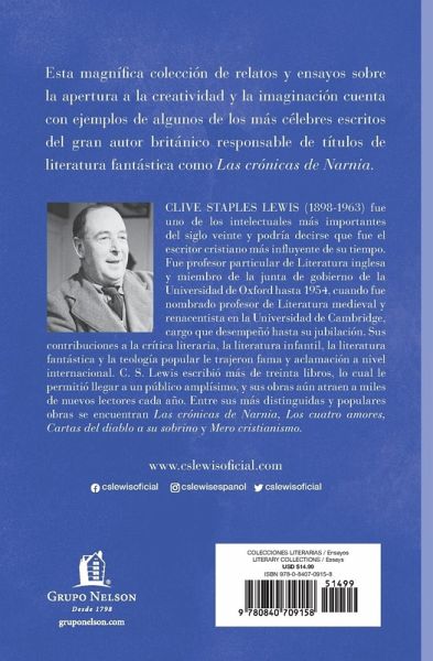 C. S. Lewis; el gran escritor brit¿¿nico, erudito, te¿¿logo laico, locutor, apologista cristiano y autor de grandes ¿¿xitos como Mero cristianismo, Cartas del diablo a su sobrino, El gran divorcio, Las cr¿¿nicas de Narnia y muchos otros cl¿¿sicos; presenta la importancia de los relatos y el asombro de la imaginaci¿¿n, elementos a menudo ignorados por los cr¿¿ticos de su ¿¿poca. Tambi¿¿n relata sus tipos de historias favoritas; cuentos infantiles y las fantas¿¿as de la mano con una visi¿¿n de sus obras m¿¿s famosas: Las cr¿¿nicas de Narnia y La trilog¿¿a c¿¿smica. Of Other Worlds C. S. Lewis; the great British writer, scholar, lay theologian, broadcaster, Christian apologist, and bestselling author of Mere Christianity, The Screwtape Letters, The Great Divorce, The Chronicles of Narnia, and many other beloved classics presents a well-reasoned case for the importance of story and wonder, elements often ignored by critics of his time. He also discusses his favorite kinds of stories; children's stories and fantasies and offers insights into his most famous works, The Chronicles of Narnia and the Space Trilogy.