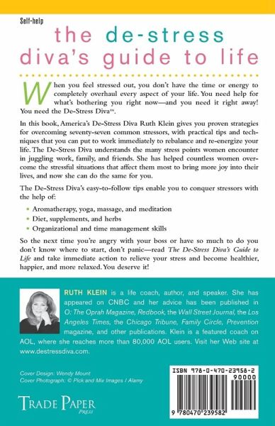The De-Stress Diva's Guide to Life When you feel stressed out, you don't have the time or energy to completely overhaul every aspect of your life. You need help for what's bothering you right now--and you need it right away! You need the De-Stress Diva. In this book, America's De-Stress Diva Ruth Klein gives you proven strategies for overcoming seventy-seven common stressors, with practical tips and techniques that you can put to work immediately to rebalance and re-energize your life. The De-Stress Diva understands the many stress points women encounter in juggling work, family, and friends. She has helped countless women overcome the stressful situations that affect them most to bring more joy into their lives, and now she can do the same for you. The De-Stress Diva's easy-to-follow tips enable you to conquer stressors with the help of: Aromatherapy, yoga, massage, and meditation Diet, supplements, and herbs Organizational and time management skills So the next time you're angry with your boss or have so much to do you don't know where to start, don't panic--read "The De-Stress Diva's Guide to Life" and take immediate action to relieve your stress and become healthier, happier, and more relaxed. You deserve it!