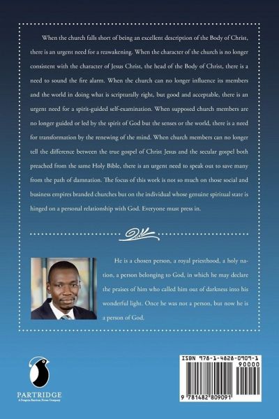 When the church falls short of being an excellent description of the Body of Christ, there is an urgent need for a reawakening. When the character of the church is no longer consistent with the character of Jesus Christ, the head of the Body of Christ, there is a need to sound the fire alarm. When the church can no longer influence its members and the world in doing what is scripturally right, but good and acceptable, there is an urgent need for a spirit-guided self-examination. When supposed church members are no longer guided or led by the spirit of God but the senses or the world, there is a need for transformation by the renewing of the mind. When church members can no longer tell the difference between the true gospel of Christ Jesus and the secular gospel both preached from the same Holy Bible, there is an urgent need to speak out to save many from the path of damnation. The focus of this work is not so much on those social and business empires branded churches but on the individual whose genuine spiritual state is hinged on a personal relationship with God. Everyone must press in.