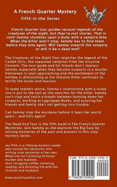 French Quarter tour guides recount legends of the creatures of the night, but they're just stories. That is until Sammy stumbles upon a body with a vampire bite. When the killer won't stop, Sammy has to find them before they "bite" again. Will Sammy unearth the "vampire" or will it be a dead end? The Creatures of the Night Tour reignites the legend of the Casket Girls, the supposed vampires from the Ursuline Convent. The tour guide and his friends don't impress Sammy, especially when they become suspects in a murder. Halloween is soon approaching and the excitement of the holiday is diminishing as the Vampire Killer continues to terrify the locals and tourists. To make matters worse, Sammy's relationship with a loved one is put to the test as she searches for the killer. All she wants to do is stop the "vampire" before he or she tears her family apart... and bites again. The Dead End Tour is the fifth book in The French Quarter Mystery Series. If you like cozy mysteries with imaginative stories, exciting settings, quirky characters, and puzzles that keep you in suspense, this series is for you! Explore New Orleans with Sammy as she solves mysteries of the past and present with the help of her family and friends. The Dead End Tour will keep you guessing in the latest installment of the French Quarter Mysteries.