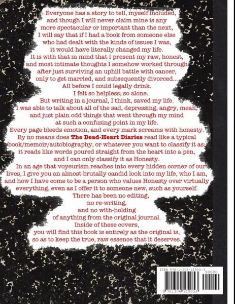 Everyone has a story to tell, myself included, and though I will never claim mine is any more spectacular or important than the next, I will say that if I had a book from someone else who had dealt with the kinds of issues I was, it would have literally changed my life. It is with that in mind that I present my raw, honest, and most intimate thoughts I somehow worked through after just surviving an uphill battle with cancer, only to get married, and subsequently divorced... All before I could legally drink. But writing in a journal, I think, saved my life. I was able to talk about all of the sad, depressing, angry, mean, and just plain odd things that went through my mind at such a confusing point in my life. Every page bleeds emotion, and every mark screams with honesty. By no means does The Dead-Heart Diaries read like a typical book/memoir/autobiography, or whatever you want to classify it as; it reads like words poured straight from the heart into a pen, and I can only classify it as Honesty.