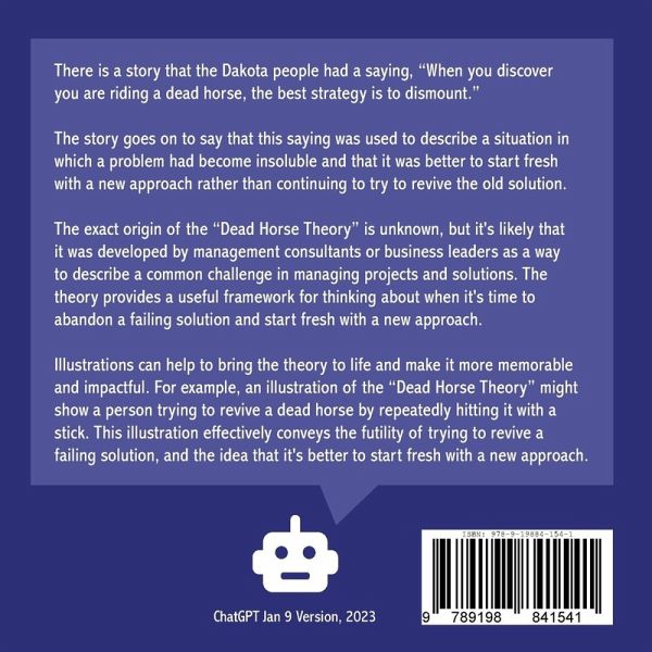 The tribal wisdom of the Dakota people which has been passed on from generation to generation, states that when you discover that you are riding a dead horse, the best strategy is to dismount. According to the Dead Horse Theory, in modern business, education, and government, it is common to use advanced strategies in an attempt to revive dead horses. This book illustrates over 60 strategies, as well as tips on how to identify a dead horse.