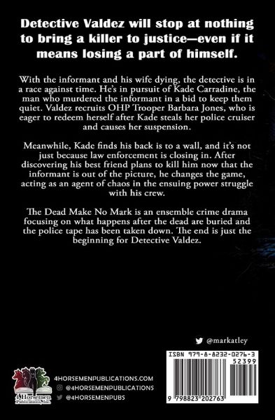 Detective Valdez will stop at nothing to bring a killer to justice-even if it means losing a part of himself. With the informant and his wife dying, the detective is in a race against time. He's in pursuit of Kade Carradine, the man who murdered the informant in a bid to keep them quiet. Valdez recruits OHP Trooper Barbara Jones, who is eager to redeem herself after Kade steals her police cruiser and causes her suspension. Meanwhile, Kade finds his back is to a wall, and it's not just because law enforcement is closing in. After discovering his best friend plans to kill him now that the informant is out of the picture, he changes the game, acting as an agent of chaos in the ensuing power struggle with his crew. The Dead Make No Mark is an ensemble crime drama focusing on what happens after the dead are buried and the police tape has been taken down. The end is just the beginning for Detective Valdez.