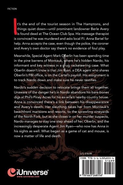 It's the end of the tourist season in The Hamptons, and things quiet down-until prominent landowner Berle Avery is found dead at The Ocean Club Spa. His massage therapist is convinced he was murdered and asks local P.I. Anna Bartel for help. Anna accepts the case, even though the police, the coroner and Avery's own doctor say there's no evidence of foul play. Meanwhile, Special Agent Mark Oberlin has been spending time in the pine barrens of Montauk, where he's hidden Nardo, his informant and key witness in a drug racketeering case. What Oberlin doesn't know is that Jim Ryan, a DEA agent who shares Oberlin's FBI office, is on the Cartel's payroll. His assignment is to track Nardo down and make sure he never testifies. Nardo's sudden decision to relocate brings them all together. Unaware of the danger he's in Nardo abandons his bare-bones digs at Phil's Piney Acres for his ex-wife's nearby country house. Anna is convinced there's a link between his disappearance and Avery's death. Her sleuthing takes her from Montauk's beachfront mansions and resorts, to the sprawling vineyards of the North Fork, but as she closes in on her murder suspects, Nardo manages to stay one step ahead of her, Oberlin, and the increasingly desperate Agent Jim Ryan-who now has Anna in his sights as well. What began as a game of cat and mouse, is now a matter of life and death.