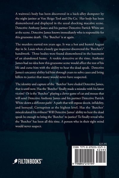 A waitress's body has been discovered in a back-alley dumpster by the night janitor at Von Sleigo Tool and Die Co. Her body has been dismembered and displayed in the usual shocking macabre scene. Detective Anthony James and his partner Detective Patrick White are at the scene. Detective James knows immediately who is responsible for this gruesome death. The 'Butcher' is at again. The murders started ten years ago. It was a hot and humid August day in St. Louis when a lonely gas inspector discovered the 'Butcher's" handiwork. Three bodies were found dismembered in the basement of an abandoned home. A rookie detective at the time, Anthony James had no idea how this gruesome scene would affect the rest of his life and curse him with the ability to hear the dead speak. Detective James's uncanny ability led him through years to solve cases and bring killers to justice that many would never have suspected. The identity and capture of the 'Butcher' have eluded Detective James, that is until now. Has the 'Butcher' finally made a mistake with his latest victim? Or is the 'Butcher'' playing a clever game of cat and mouse that will send Detective Anthony James and his partner Detective Patrick White down a different path? A path that will expose deceit, infidelity, and betrayal. Corruption at the highest level. Has the 'Butcher' miscalculated his evilness? Will Detective James' ability to hear the dead speak be enough to bring the 'Butcher' to justice? To finally reveal who the 'Butcher' has been all this time. A person who in their right mind would never suspect.