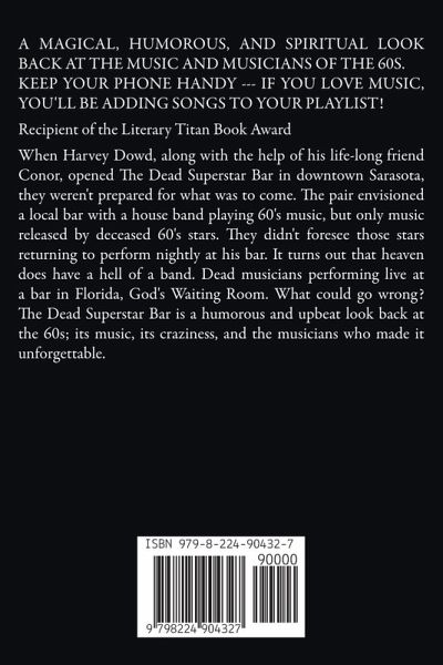 A MAGICAL, HUMOROUS, AND SPIRITUAL LOOK BACK AT THE MUSIC AND MUSICIANS OF THE 60S. KEEP YOUR PHONE HANDY --- IF YOU LOVE MUSIC, YOU'LL BE ADDING SONGS TO YOUR PLAYLIST! Recipient of the Literary Titan Book Award When Harvey Dowd, along with the help of his life-long friend Conor, opened The Dead Superstar Bar in downtown Sarasota, they weren't prepared for what was to come. The pair envisioned a local bar with a house band playing 60's music, but only music released by deceased 60's stars. They didn't foresee those stars returning to perform nightly at his bar. It turns out that heaven does have a hell of a band. Dead musicians performing live at a bar in Florida, God's Waiting Room. What could go wrong? The Dead Superstar Bar is a humorous and upbeat look back at the 60s; its music, its craziness, and the musicians who made it unforgettable.