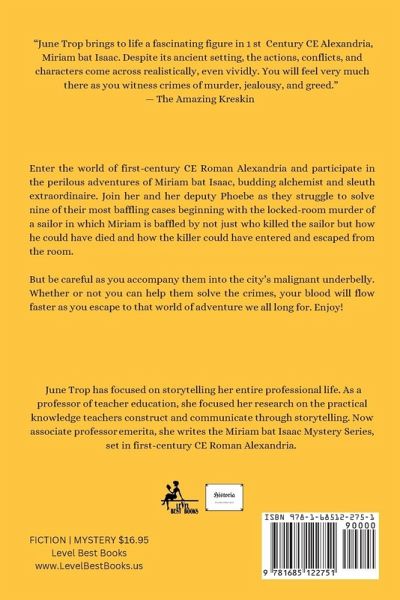 Enter the world of first-century CE Roman Alexandria and participate in the perilous adventures of Miriam bat Isaac, budding alchemist and sleuth extraordinaire. Join her and her deputy Phoebe as they struggle to solve nine of their most baffling cases beginning with the locked-room murder of a sailor in which Miriam is baffled by not just who killed the sailor but how he could have died and how the killer could have entered and escaped from the room. ¿But be careful as you accompany them into the city's malignant underbelly. Whether or not you can help them solve the crimes, your blood will flow faster as you escape to that world of adventure we all long for. Enjoy!