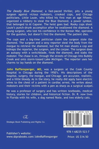 The Deadly Blue Diamond, a fast-paced thriller, pits a young surgeon against vicious mobsters, crooked cops, and Chicago politicians. Little Louie, who killed his first man at age fifteen, organized a robbery to steal the Blue Diamond, a power symbol, that belonged to Al Capone. The heist goes bad. Rooky cops shoot Louie's punch-drunk accomplice after he swallowed the diamond. A young surgeon, who lost his confidence in the Korean War, operates for the gunshot, but doesn't find the diamond. The patient dies. The cops and a big-time politician claim the surgeon stole the diamond. The surgeon and a sexy reporter steal the body from the morgue to retrieve the diamond, but the hit man shoots a cop and kidnaps the reporter, the surgeon, and the corpse. The surgeon does an autopsy with a switchblade, finds the diamond, and stabs the mobster. The chase is on, through the streets of Chicago into Bubbly Creek and onto storm-tossed Lake Michigan. The reporter uses her charms to lay hands on the diamond. About The Author: John Raffensperger, MD, was a surgeon at the Cook County Hospital in Chicago during the 1950's. His descriptions of the hospital, surgery, the morgue, and Chicago are accurate, realistic, and a little bloody. As in the story, he really did apply bare electric wires to the chest of a patient in cardiac arrest. He writes about mobsters and their victims with a pen as sharp as a surgical scalpel. He was a professor of surgery and has written textbooks, medical history, stories for children, and historical fiction. Dr. R. now lives in Florida with his wife, a dog named Rosie, and two elderly cats.