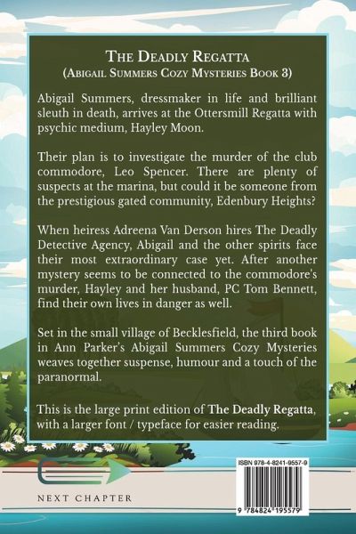 Abigail Summers, dressmaker in life and brilliant sleuth in death, arrives at the Ottersmill Regatta with psychic medium, Hayley Moon. Their plan is to investigate the murder of the club commodore, Leo Spencer. There are plenty of suspects at the marina, but could it be someone from the prestigious gated community, Edenbury Heights? When heiress Adreena Van Derson hires The Deadly Detective Agency, Abigail and the other spirits face their most extraordinary case yet. After another mystery seems to be connected to the commodore's murder, Hayley and her husband, PC Tom Bennett, find their own lives in danger as well. Set in the small village of Becklesfield, the third book in Ann Parker's Abigail Summers Cozy Mysteries weaves together suspense, humour and a touch of the paranormal. This is the large print edition of The Deadly Regatta, with a larger font / typeface for easier reading.