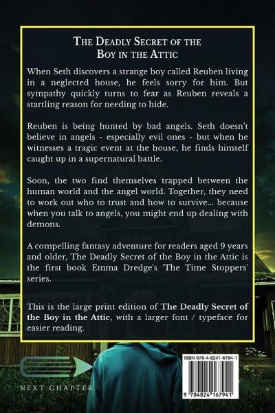 When Seth discovers a strange boy called Reuben living in a neglected house, he feels sorry for him. But sympathy quickly turns to fear as Reuben reveals a startling reason for needing to hide. Reuben is being hunted by bad angels. Seth doesn't believe in angels - especially evil ones - but when he witnesses a tragic event at the house, he finds himself caught up in a supernatural battle. Soon, the two find themselves trapped between the human world and the angel world. Together, they need to work out who to trust and how to survive... because when you talk to angels, you might end up dealing with demons. A compelling fantasy adventure for readers aged 9 years and older, The Deadly Secret of the Boy in the Attic is the first book Emma Dredge's 'The Time Stoppers' series. This is the large print edition of The Deadly Secret of the Boy in the Attic, with a larger font / typeface for easier reading.