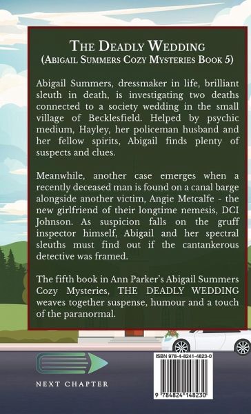 Abigail Summers, dressmaker in life, brilliant sleuth in death, is investigating two deaths connected to a society wedding in the small village of Becklesfield. Helped by psychic medium, Hayley, her policeman husband and her fellow spirits, Abigail finds plenty of suspects and clues. Meanwhile, another case emerges when a recently deceased man is found on a canal barge alongside another victim, Angie Metcalfe - the new girlfriend of their longtime nemesis, DCI Johnson. As suspicion falls on the gruff inspector himself, Abigail and her spectral sleuths must find out if the cantankerous detective was framed. The fifth book in Ann Parker's Abigail Summers Cozy Mysteries, THE DEADLY WEDDING weaves together suspense, humour and a touch of the paranormal.