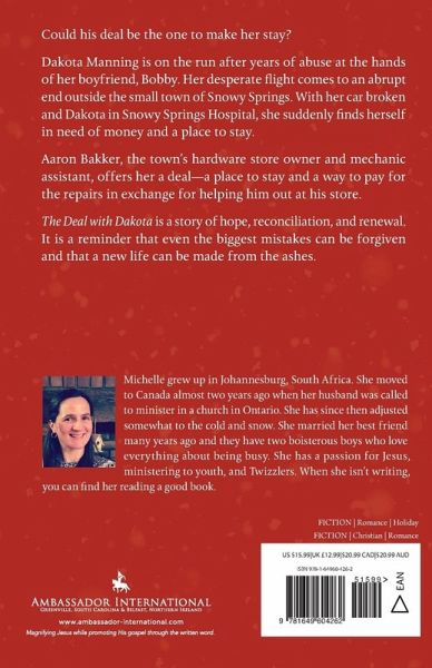Could his deal be the one to make her stay? Dakota Manning is on the run after years of abuse at the hands of her boyfriend, Bobby. Her desperate flight comes to an abrupt end outside the small town of Snowy Springs. With her car broken and Dakota in Snowy Springs Hospital, she suddenly finds herself in need of employment and a place to stay. Aaron Bakker, the town's hardware store owner and mechanic assistant, offers her a deal-a place to stay and a way to pay for the repairs in exchange for helping him out at his store. The Deal with Dakota is a story of hope, reconciliation, and renewal. It is a reminder that even the biggest mistakes can be forgiven and that a new life can be made from the ashes.