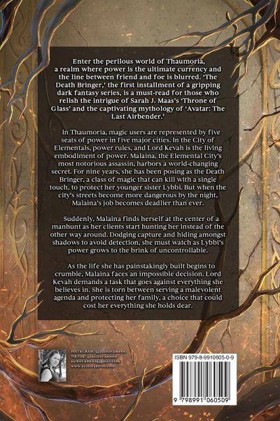 Enter the perilous world of Thaumoria, a realm where power is the ultimate currency and the line between friend and foe is blurred. 'The Death Bringer,' the first installment of a gripping dark fantasy series, is a must-read for those who relish the intrigue of Sarah J. Maas's 'Throne of Glass' and the captivating mythology of 'Avatar: The Last Airbender.' In Thaumoria, magic users are represented by five seats of power in five major cities. In the City of Elementals, power rules, and Lord Kevah is the living embodiment of power. Malaina, the Elemental City's most notorious assassin, harbors a world-changing secret. For nine years, she has been posing as the Death Bringer, a class of magic that can kill with a single touch, to protect her younger sister Lybbi. But when the city's streets become more dangerous by the night, Malaina's job becomes deadlier than ever. Suddenly, Malaina finds herself at the center of a manhunt as her clients start hunting her instead of the other way around. Dodging capture and hiding amongst shadows to avoid detection, she must watch as Lybbi's power grows to the brink of uncontrollable. As the life she has painstakingly built begins to crumble, Malaina is faced with an impossible decision. Lord Kevah demands a task that goes against everything she believes in. She is torn between serving a malevolent agenda and protecting her family, a choice that could cost her everything she holds dear.