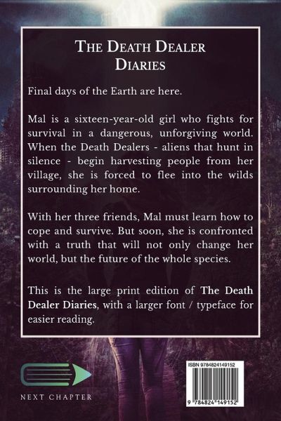 Final days of the Earth are here. Mal is a sixteen-year-old girl who fights for survival in a dangerous, unforgiving world. When the Death Dealers - aliens that hunt in silence - begin harvesting people from her village, she is forced to flee into the wilds surrounding her home. With her three friends, Mal must learn how to cope and survive. But soon, she is confronted with a truth that will not only change her world, but the future of the whole species. This is the large print edition of The Death Dealer Diaries, with a larger font / typeface for easier reading.