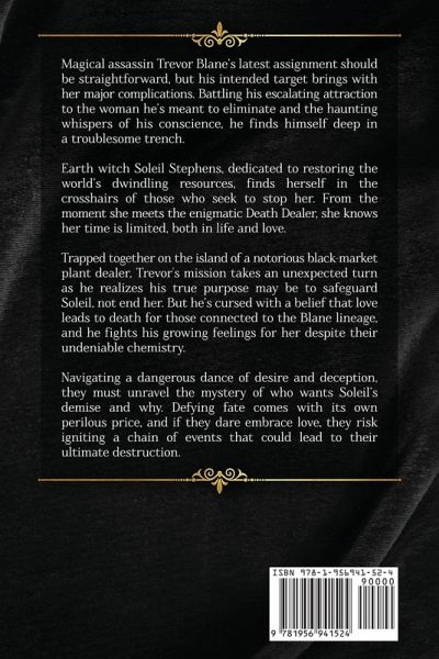 Magical assassin Trevor Blane's latest assignment should be straightforward, but his intended target brings with her major complications. Battling his escalating attraction to the woman he's meant to eliminate and the haunting whispers of his conscience, he finds himself deep in a troublesome trench. Earth witch Soleil Stephens, dedicated to restoring the world's dwindling resources, finds herself in the crosshairs of those who seek to stop her. From the moment she meets the enigmatic Death Dealer, she knows her time is limited, both in life and love. Trapped together on the island of a notorious black-market plant dealer, Trevor's mission takes an unexpected turn as he realizes his true purpose may be to safeguard Soleil, not end her. But he's cursed with a belief that love leads to death for those connected to the Blane lineage, and he fights his growing feelings for her despite their undeniable chemistry. Navigating a dangerous dance of desire and deception, they must unravel the mystery of who wants Soleil's demise and why. Defying fate comes with its own perilous price, and if they dare embrace love, they risk igniting a chain of events that could lead to their ultimate destruction.