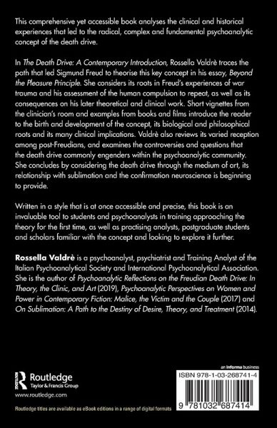 In The Death Drive: A Contemporary Introduction, Rossella Valdrè traces the path that led Sigmund Freud to theorise this key concept in his essay, Beyond the Pleasure Principle. She considers its roots in Freud's experiences of war trauma and his assessment of the human compulsion to repeat, as well as its consequences on his later theoretical and clinical work. Short vignettes from the clinician's room and examples from books and films introduce the reader to the birth and development of the concept, its biological and philosophical roots and its many clinical implications. Valdrè also reviews its varied reception among post-Freudians, and examines the controversies and questions that the death drive commonly engenders within the psychoanalytic community. She concludes by considering the death drive through the medium of art, its relationship with sublimation and the confirmation neuroscience is beginning to provide.