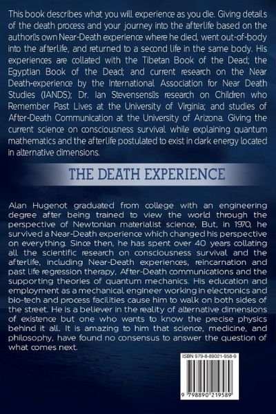This book describes what you will experience as you die. Giving details of the death process and your journey into the afterlife based on the author's own Near-Death experience where he died, went out-of-body into the afterlife, and returned to a second life in the same body. His experiences are collated with the Tibetan Book of the Dead; the Egyptian Book of the Dead; and current research on the Near Death-experience by the International Association for Near Death Studies (IANDS); Dr. Ian Stevensens' research on Children who Remember Past Lives at the University of Virginia; and studies of After-Death Communication at the University of Arizona. Giving the current science on consciousness survival while explaining quantum mathematics and the afterlife postulated to exist in dark energy located in alternative dimensions. Alan Hugenot graduated from college with an engineering degree after being trained to view the world through the perspective of Newtonian materialist science, But, in 1970, he survived a Near-Death experience which changed his perspective on everything. Since then, he has spent over 40 years collating all the scientific research on consciousness survival and the afterlife, including Near-Death experiences, reincarnation and past life regression therapy, After-Death communications and the supporting theories of quantum mechanics. His education and employment as a mechanical engineer working in electronics and bio-tech and process facilities cause him to walk on both sides of the street. He is a believer in the reality of alternative dimensions of existence but one who wants to know the precise physics behind it all. It is amazing to him that science, medicine, and philosophy, have found no consensus to answer the question of what comes next.