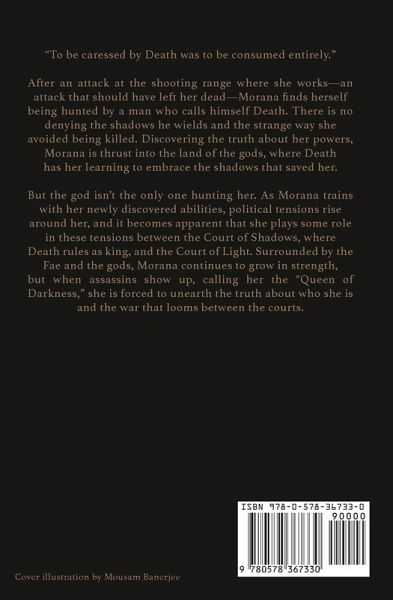 "To be caressed by Death was to be consumed entirely." After an attack at the shooting range where she works-an attack that should have left her dead-Morana finds herself being hunted by a man who calls himself Death. There is no denying the shadows he wields and the strange way she avoided being killed. Discovering the truth about her powers, Morana is thrust into the land of the gods, where Death has her learning to embrace the shadows that saved her. But the god isn't the only one hunting her. As Morana trains with her newly discovered abilities, political tensions rise around her, and it becomes apparent that she plays some role in these tensions between the Court of Shadows, where Death rules as king, and the Court of Light. Surrounded by the Fae and the gods, Morana continues to grow in strength, but when assassins show up, calling her the "Queen of Darkness," she is forced to unearth the truth about who she is and the war that looms between the courts.