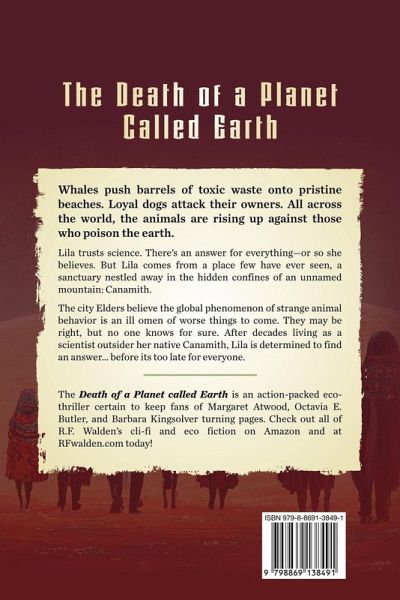 The Death of a Planet called Earth Whales push barrels of toxic waste onto pristine beaches. Loyal dogs attack their owners. All across the world, the animals are rising up against those who poison the earth. Lila trusts science. There's an answer for everything-or so she believes. But Lila comes from a place few have ever seen, a sanctuary nestled away in the hidden confines of an unnamed mountain: Canamith. The city Elders believe the global phenomenon of strange animal behavior is an ill omen of worse things to come. They may be right, but no one knows for sure. After decades living as a scientist outsider her native Canamith, Lila is determined to find an answer... before its too late for everyone. The Death of a Planet called Earth is an action-packed eco-thriller certain to keep fans of Margaret Atwood, Octavia E. Butler, and Barbara Kingsolver turning pages. Check out all of R.F. Walden's cli-fi and eco fiction on Amazon and at RFwalden.com today!