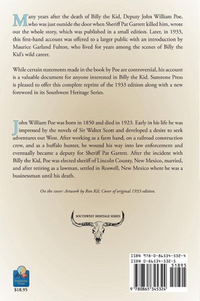 Many years after the death of Billy the Kid, Deputy John William Poe, who was just outside the door when Sheriff Pat Garrett killed him, wrote out the whole story, which was published in a small edition. Later, in 1933, this first-hand account was offered to a larger public with an introduction by Maurice Garland Fulton, who lived for years among the scenes of Billy the Kid's wild career. While certain statements made in the book by Poe are controversial, his account is a valuable document for anyone interested in Billy the Kid. Sunstone Press is pleased to offer this complete reprint of the 1933 edition along with a new forward in its Southwest Heritage Series. John William Poe was born in 1850 and died in 1923. Early in his life he was impressed by the novels of Sir Walter Scott and developed a desire to seek adventures out West. After working as a farm hand, on a railroad construction crew, and a buffalo hunter, he wound his way into law enforcement and eventually became a deputy for Sheriff Pat Garrett. After the incident with Billy the Kid, Poe was elected sheriff of Lincoln County, New Mexico, married, and after retiring as a lawman, settled in Roswell, New Mexico where he was a businessman until his death.