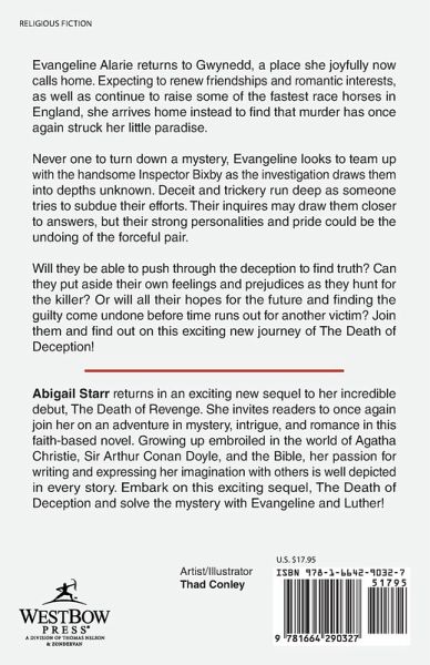 Evangeline Alarie returns to Gwynedd, a place she joyfully now calls home. Expecting to renew friendships and romantic interests, as well as continue to raise some of the fastest race horses in England, she arrives home instead to find that murder has once again struck her little paradise. Never one to turn down a mystery, Evangeline looks to team up with the handsome Inspector Bixby as the investigation draws them into depths unknown. Deceit and trickery run deep as someone tries to subdue their efforts. Their inquires may draw them closer to answers, but their strong personalities and pride could be the undoing of the forceful pair. Will they be able to push through the deception to find truth? Can they put aside their own feelings and prejudices as they hunt for the killer? Or will all their hopes for the future and finding the guilty come undone before time runs out for another victim? Join them and find out on this exciting new journey of The Death of Deception!