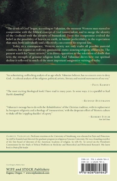 ""The death of God"" began, according to Vahanian, the moment Western man started to compromise with the Biblical concept of God transcendent, and to merge the identity of the Godhead with the identity of humankind. From this compromise evolved the belief in the possibility of heaven on earth, in human perfectibility, in the expectation that man, both individually and collectively, can control his termporal fate. Today, as a consequence, Western society not only exalts all possible material comforts, but requires as well easy, guaranteed, status-assuring religious affiliations. The present search for ""inner security"" is in direct opposition to the toleration of doubt that tests the strength of genuine religious faith. And Vahanian shows how our spiritual decline is reflected in much of the most important imaginative writing of today.
