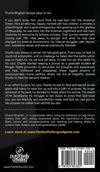Charlie Bingham always plays to win. If you didn't know him, you'd think he was born into the American Dream. He's an attorney, happily married with two children, a minister, a philanthropist, and a serial entrepreneur. But growing up in the ghettos of Milwaukee, he was born into the American nightmare and had many obstacles to overcome to achieve success. That journey started with moving over 700 miles away to escape. And while he may have changed his external environment, his internal struggles with depression, substance abuse, and sexual promiscuity followed. Charlie was always a winner. He had good game. There was no feat he could not accomplish, and no challenge he failed. But the battle within was no match for his wit and will alone. To help him win the battle for his soul, Charlie started keeping a journal as a graduate student at Morgan State University to document his thoughts and experiences and heal. Unfiltered and unabashed, these logged streams of consciousness--some positive, others not, but all insightful, allowed Charlie to face his demons head-on. In an effort to save his soul, Charlie turned to God and leaned on His grace and mercy to raise him up and into a path of purpose. No longer ashamed of his past, he decided to finally share his journal, The Death of Mr. GoodGame: My Struggle to Get Sober, to prove that God loves you, you are fearfully and wonderfully made, and God can use you for His purpose no matter how ratchet you are.