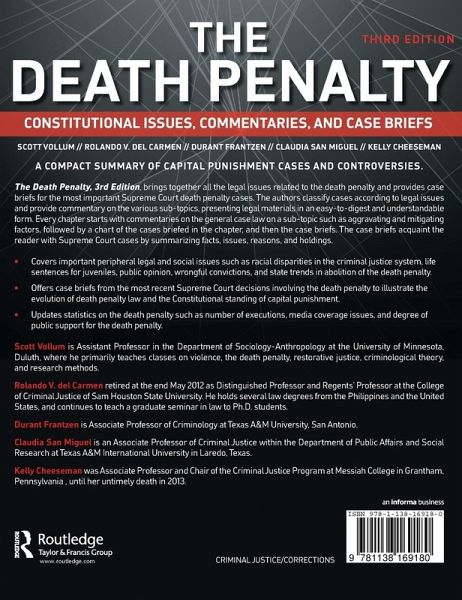 Scott Vollum is an Assistant Professor in the Department of Sociology-Anthropology at the University of Minnesota, Duluth, where he primarily teaches classes on violence, the death penalty, restorative justice, criminological theory, and research methods. He conducts research and writes on a variety of topics related to the death penalty, including attitudes about the death penalty and experiences of those impacted by the death penalty (e.g., condemned death row inmates, co-victims of capital murder, and death row exonerees). He also conducts research on and writes about moral disengagement, restorative justice, violence against animals, and crime and justice in popular culture. The late Rolando V. del Carmen was Distinguished Professor of Criminal Justice (Law) in the College of Criminal Justice, Sam Houston State University. He authored numerous books and articles in various areas of law related to criminal justice. He won all three major awards given by the Academy of Criminal Justice Sciences, taught numerous graduate and undergraduate classes in law, and was a mentor and friend to a great many of his students. Durant Frantzen is Associate Professor of Criminology in the College of Arts and Sciences at Texas A&M University, San Antonio. His research focuses on offender reentry and recidivism, domestic violence policy, and the death penalty. He teaches courses on forensic psychology, statistics, victimology, and comparative systems in criminal justice. Claudia San Miguel is an Associate Professor of Criminal Justice and Chair of the Department of Public Affairs and Social Research at Texas A&M International University in Laredo, Texas. Her research focuses on the trafficking of women and children, dating violence, domestic violence, and various policing issues. She has traveled to England, Poland, Sweden, Austria, and Spain to help form collaborative relationships with their anti-trafficking task forces. She has also taught courses for the Department of State in Roswell, New Mexico, on global human trafficking at the International Law Enforcement Academy. The late Kelly Cheeseman was Associate Professor and Chair of the Criminal Justice Program at Messiah College in Grantham, Pennsylvania. Her research interests included female offenders, prison deviance, correctional officer stress and job satisfaction, institutional corrections, the death penalty, ethics, and sexually deviant behavior.