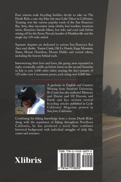Four veteran male bicycling buddies decide to take on The Death Ride, a one-day bike ride near Lake Tahoe in California. Training over the various popular roads of the San Francisco Bay Area, they encounter steep climbs, bad weather, vexatious wives, flirtatious female bikers, hot tubs and road rash before setting off for the Sierra Nevada hamlet of Markleeville and the single day 129-mile ordeal. Separate chapters are dedicated to various San Francisco Bay Area road climbs: Tunitas Creek, Old La Honda, Kings Mountain, Sierra, Mount Hamilton, Mount Diablo and several others, including the history behind each. Interweaving their lives and loves, the group, now expanded to eight, eventually saddle up before dawn on the second Saturday in July to join 3,000 other riders starting the day's journey of 129 miles over 5 mountain passes, each rising over 8,000 feet.