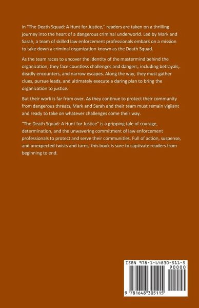 In "The Death Squad: A Hunt for Justice," readers are taken on a thrilling journey into the heart of a dangerous criminal underworld. Led by Mark and Sarah, a team of skilled law enforcement professionals embark on a mission to take down a criminal organization known as the Death Squad. As the team races to uncover the identity of the mastermind behind the organization, they face countless challenges and dangers, including betrayals, deadly encounters, and narrow escapes. Along the way, they must gather clues, pursue leads, and ultimately execute a daring plan to bring the organization to justice. But their work is far from over. As they continue to protect their community from dangerous threats, Mark and Sarah and their team must remain vigilant and ready to take on whatever challenges come their way. "The Death Squad: A Hunt for Justice" is a gripping tale of courage, determination, and the unwavering commitment of law enforcement professionals to protect and serve their communities. Full of action, suspense, and unexpected twists and turns, this book is sure to captivate readers from beginning to end.