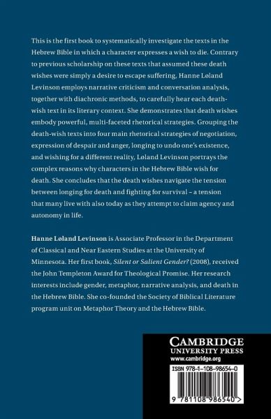 The first book to explore the texts in the Hebrew Bible in which a character expresses a wish to die. The death wish is a powerful rhetorical strategy that provides an unrecognized source of empowerment for characters. Written to engage the general reader and students in religion and biblical studies.