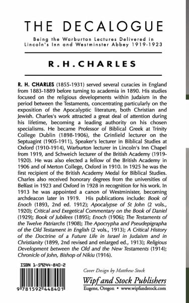 R.H. Charles was born August 6, 1855 in Cookstown, Co. Tyrone. He was educated at Belfast Academy, Queen's College Belfast (Classics, 1874-80), and Trinity College Dublin (Classics and Theology). Charles was ordained a deacon in 1883 and priest in 1884. He married Mary Lilias, 1886; they had no children. He served several curacies in England from 1883-89 before turning to academia in 1890. His studies focused on the religious developments within Judaism in the period between the Testaments, concentrating particularly on the exposition of the Apocalyptic literature, both Christian and Jewish. Charles's work attracted a great deal of attention during his lifetime, becoming a leading authority on his chosen specialties. He became Professor of Biblical Greek at Trinity College Dublin (1898-1906), the Grinfield Lecturer on the Septuagint (1905-11), Speaker's Lecturer in Biblical Studies at Oxford (1910-14), Warburton Lecturer in Lincoln's Inn Chapel from 1919, and Schweich Lecturer of the British Academy (1919-20). He was also elected a fellow of the British Academy in 1906 and of Merton College, Oxford in 1910. In 1925 he was the first recipient of the British Academy Medal for Biblical Studies. Charles also received honorary degrees from the universities of Belfast in 1923 and Oxford in 1928 in recognition for his work. In 1913 he was appointed a canon of Westminister, becoming archdeacon later in 1919. He died at his home in Little Cloisters on January 30, 1931. His publications include: Book of Enoch (1893, 2nd ed. 1912); Apocalypse of St John ( 2 vols., 1920); Critical and Exegetical Commentary on the Book of Daniel (1929); Book of Jubilees (1895); Enoch (1906); The Testaments of the Twelve Patriarchs (1908); The Apocrypha and Pseudepigrapha of the Old Testament in English (2 vols., 1913); A Critical History of the Doctrine of a Future Life in Israel in Judaism and in Christianity"" (1899, 2nd revised and enlarged ed., 1913); ""Religious Development between the Old and the New Testaments"" (1914); ""Chronicle of John, Bishop of Nikiu"" (1916).